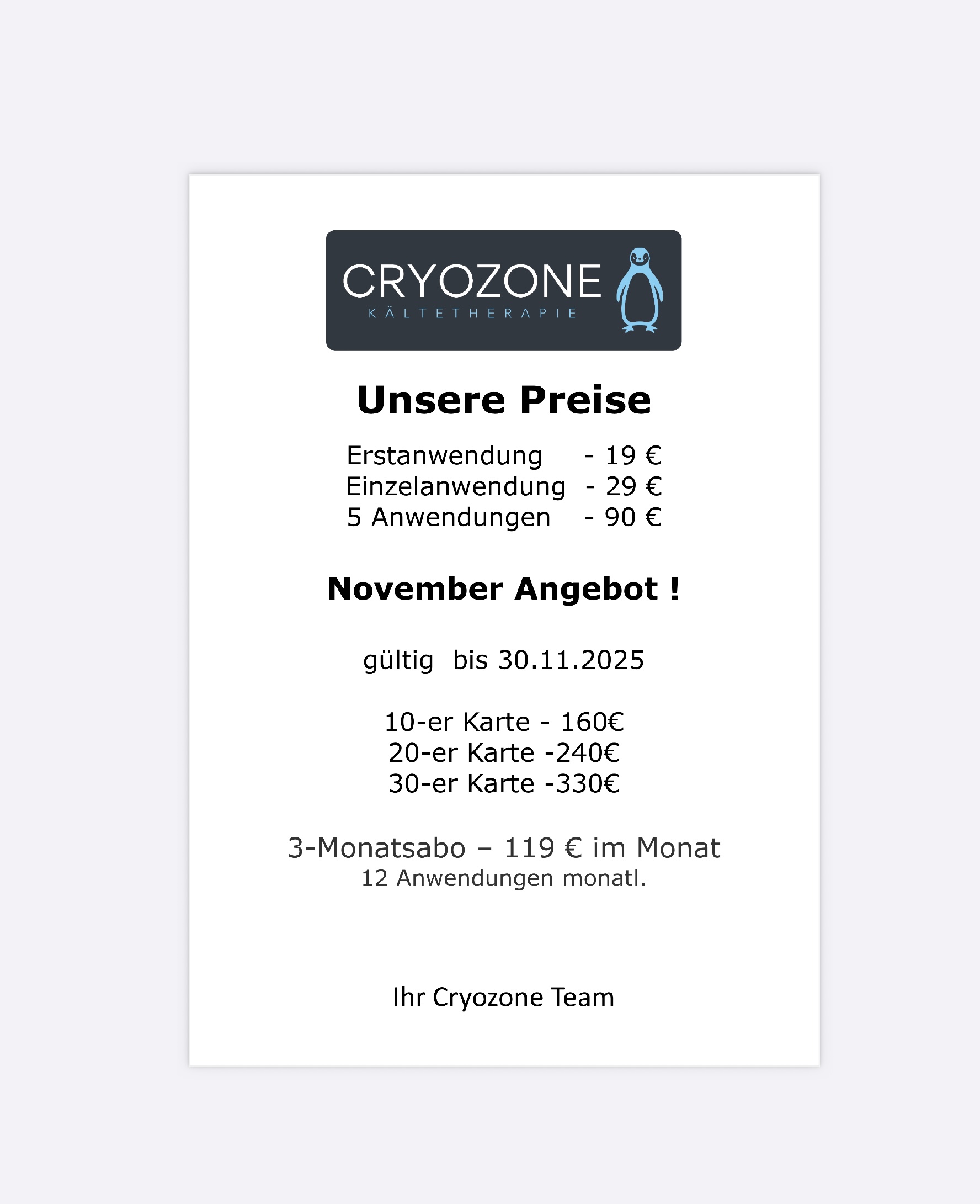 Bei CRYOZONE stehen wir Ihnen zur Seite, um Ihnen die vielfältigen Vorteile der Kältetherapie zugänglich zu machen. Unser erfahrenes Team freut sich darauf, Sie in unserer modernen Einrichtung in Hamburg Eppendorf willkommen zu heißen und Sie auf Ihrem Weg zu Ihrem persönlichen Wohlbefinden zu begleiten.
